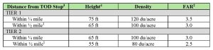 3 For projects immediately adjacent to a transit stop, an “adjacency intensifier” allows an additional 20 feet of height, 40 extra units per acre, and a 1.0 FAR increase, prior to any density bonus.